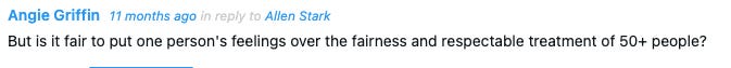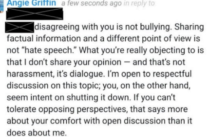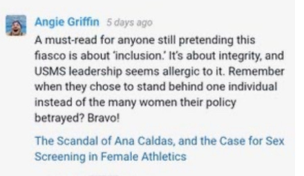 On November 21, Angie received an email from USMS apprising her that a USMS member had filed a grievance against her, claiming her posts on the Community Forum violated USMS’s Code of Ethics, including failure to treat fellow members with respect and dignity, and displaying unsporting conduct. The grievance referenced only two of Angie’s posts as evidence of ethics violations—the one that included the link to the Quillette article, above, and this one: