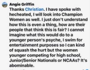 Which is why it took them four months to reply. Angie and company also filed a protest about ANOTHER male swimmer at the 2025 National meet who won nothing. Two weeks later, USMS responded that that man was indeed eligible to compete in the women’s category. Since this man received no awards, according to USMS policy, he could participate in women’s events without submitting documentation of his testosterone levels. Just a not very talented man competing in women’s events to affirm his identity. Completely valid, according to USMS policy.