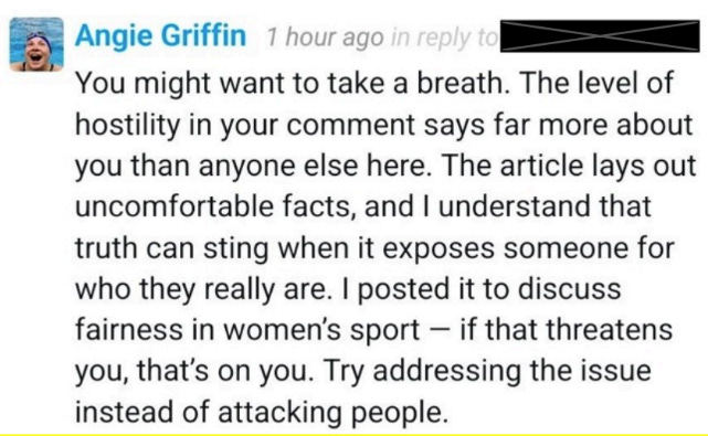 At the now-postponed hearing, Angie and the grievant will have 30 minutes each to state their cases. The bitter irony of this insane kangaroo court is the number of egregious ethics and human rights violations that are NOT being reviewed: A man has lied, cheated, and presented falsified documents to steal more than 30 women’s national and world titles in four different sports for 16 years; a national sports organization knowingly violated women’s right to fair sport, failed to follow the procedures of their own unfair policy, and lied to members about a man’s sex; disagreement has been criminalized by calling it misconduct; and that national sports organization has facilitated a campaign of abuse against the woman who pointed out these violations and failures.