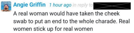 Angie, that troublesome and well-informed protester, continued: “The rules are unclear about the exact information and when exactly in the one year period the test results must be done. And the level of testosterone that would meet the testing requirement is double that of a typical woman. How is this fair by any standard?”