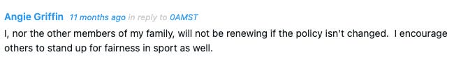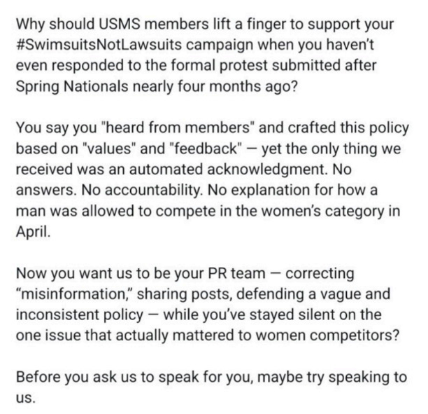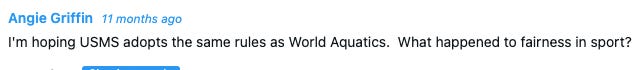 This Community Forum thread was started around the date of the 2025 USMS National Championship by another USMS member who saw obvious unfairness in USMS’s policy. Many of the commenters agreed with this position, some in much less measured manner than Angie did, but her comments were singled out.