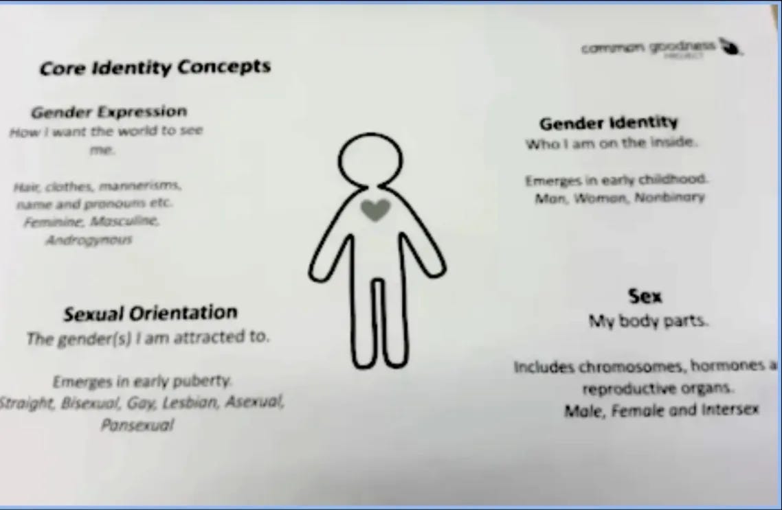 During those 54 days, 13 female athletes at Emerald Ridge High School, including girls on the wrestling team with the male wrestler, filed a complaint with their school that some boys in their locker room were making them uncomfortable as they undressed. The boys weren’t changing clothes; they were just watching the girls do so. That’s voyeurism. The girls simply did not recognize it as the offense that it is. One of those boys was the wrestler who was accused of sexual assault. The principal, Ed Crow, sent an email to the girls' parents, saying he'd spoken with the "girls" (boys), asking them to use a different changing space. Even if he had to pretend this was not voyeurism, the principal understood the reality of the situation—that females were uncomfortable undressing in front of males, and that this was not right. The boys did not come into the girls’ locker room, for one day. But then they decided they wanted to use the girls' locker room, because they could. By law. So they returned to the girls’ locker room, just watching the girls undress. And no one, not even school officials, could prevent them. When the girls again complained to Emerald Ridge school officials about the fact that the boys were still in their locker room, watching them undress, they were presented with printouts defining gender identity concepts.