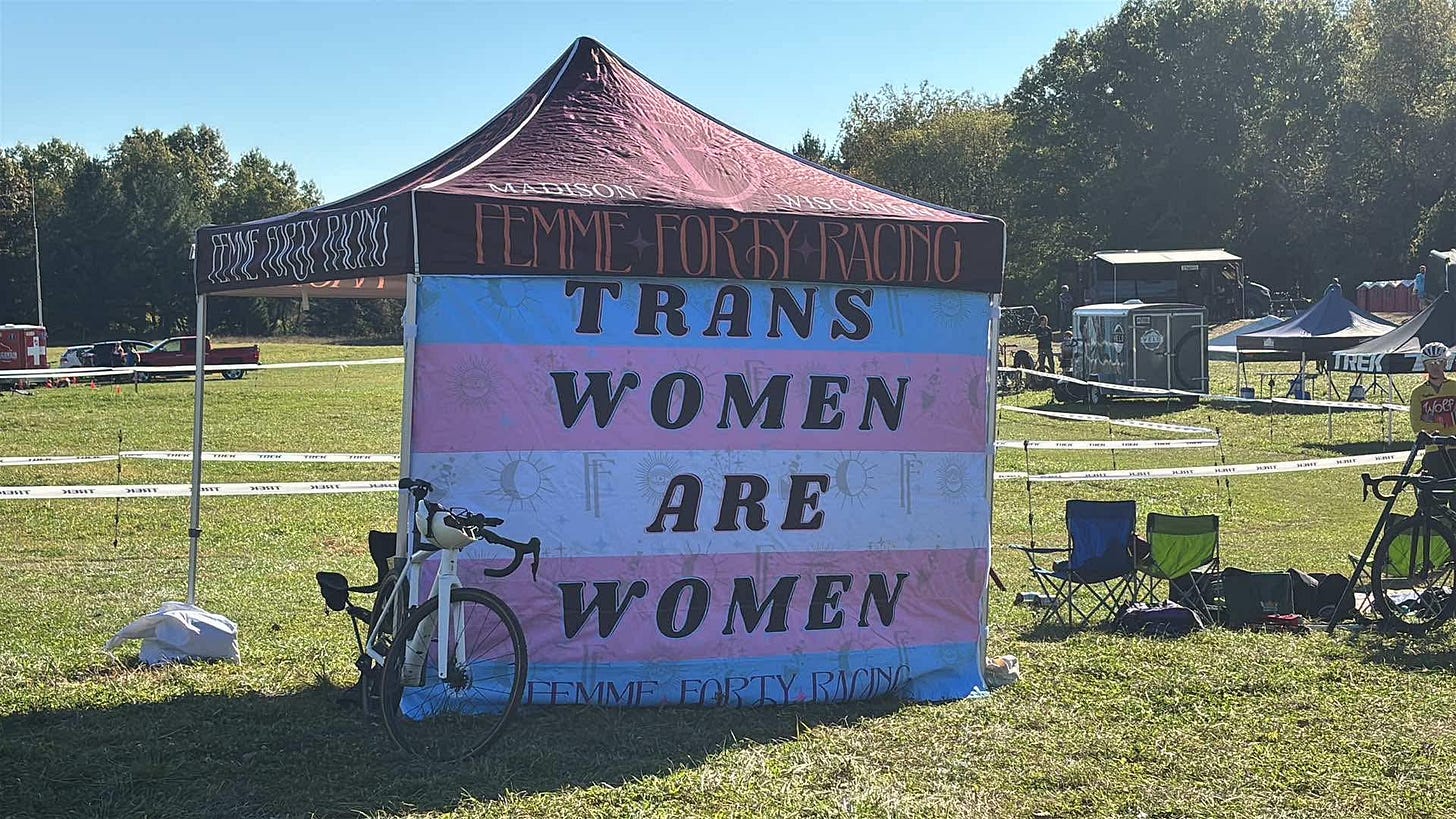 If cycling’s eagerness to embrace men in women’s racing was zealous before the September 15th policy change, the reaction since has been nothing less than desperate. The photo above was taken at the Englewood Open CX in Wisconsin on the weekend of October 11-12. Apparently it was only displayed during the women’s category 4 race, and was taken down after another team asked Femme Forty Racing, a team for women and nonbinary people, to do so.