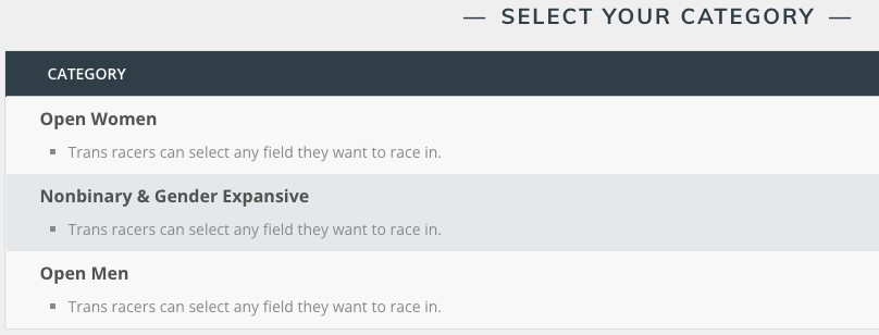 The most current policy starts out using the identical language as the Executive Order: “Pursuant to the requirements set out above, the Women’s Category is limited to individuals who meet the following definition of female: ‘Female means a person belonging, at conception, to the sex that produces the large reproductive cell.’” All well and good. But in the next section, things start going all loophole-y. Sex is determined by what you put on your USAC membership application or race registration, and is presumed to be correct. Which sounds an awful lot like self-ID. Only USAC can challenge someone’s female status, and if they do, sex will be determined by birth certificate, which can easily be changed. All this policy protects is USAC’s NGB status. In practice, nothing has changed for women.